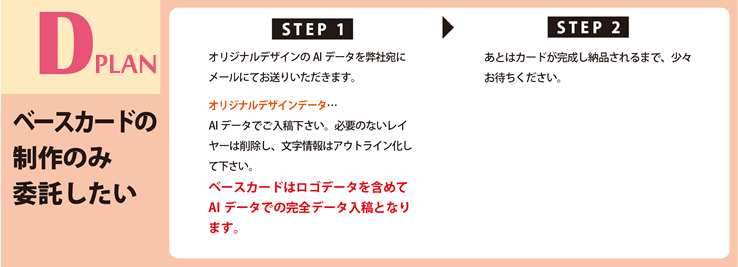 オリジナルデザインのカードをデータ入稿される場合はAI データをメールに添付してお送りいただくか、 メディアを郵送して頂きます。なおその際、文字はアウトライン化してください。弊社でのデザインの変更 は行っておりません。完全データでの入稿をお願いします。 データに不備があった場合、納品の遅れや印刷ミスなどのトラブルが起きる可能性がございますのでご注 意ください。