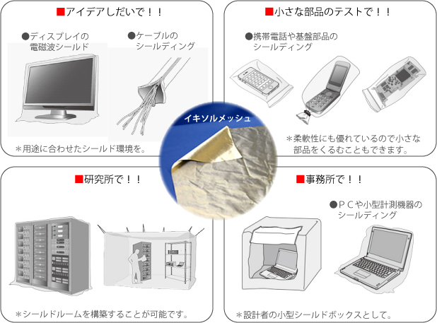 開発・試験の効率アップに大きく貢献 高い導電性を持つイキソルメッシュは、事務所・作業場・研究室などでも信頼性の高い試験を行うことができ、開発や試験の効率アップを図ることができます。 |